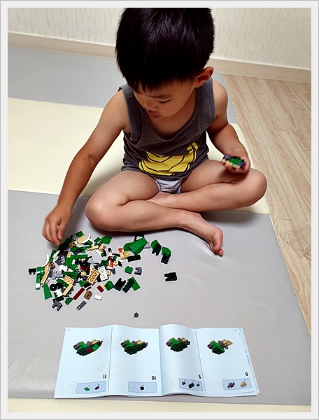바닥에 자리 잡고 앉아 설명서를 보며 차례대로 조립하는 5살 아이!!