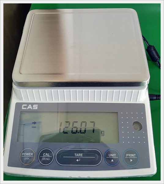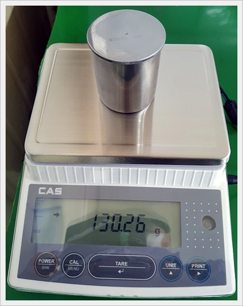 5) 저울에 무게를 측정한다. 130.26에서 소수점은 버리고 130이 비중이 된다.