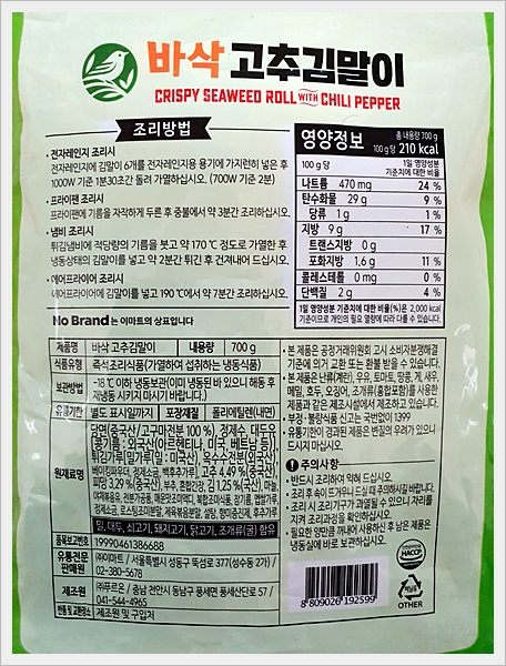 김을 제외하고는 대부분 재료가 수입산이지만 가성비를 위해 포기할 것은 과감하게 포기해야 합니다.
