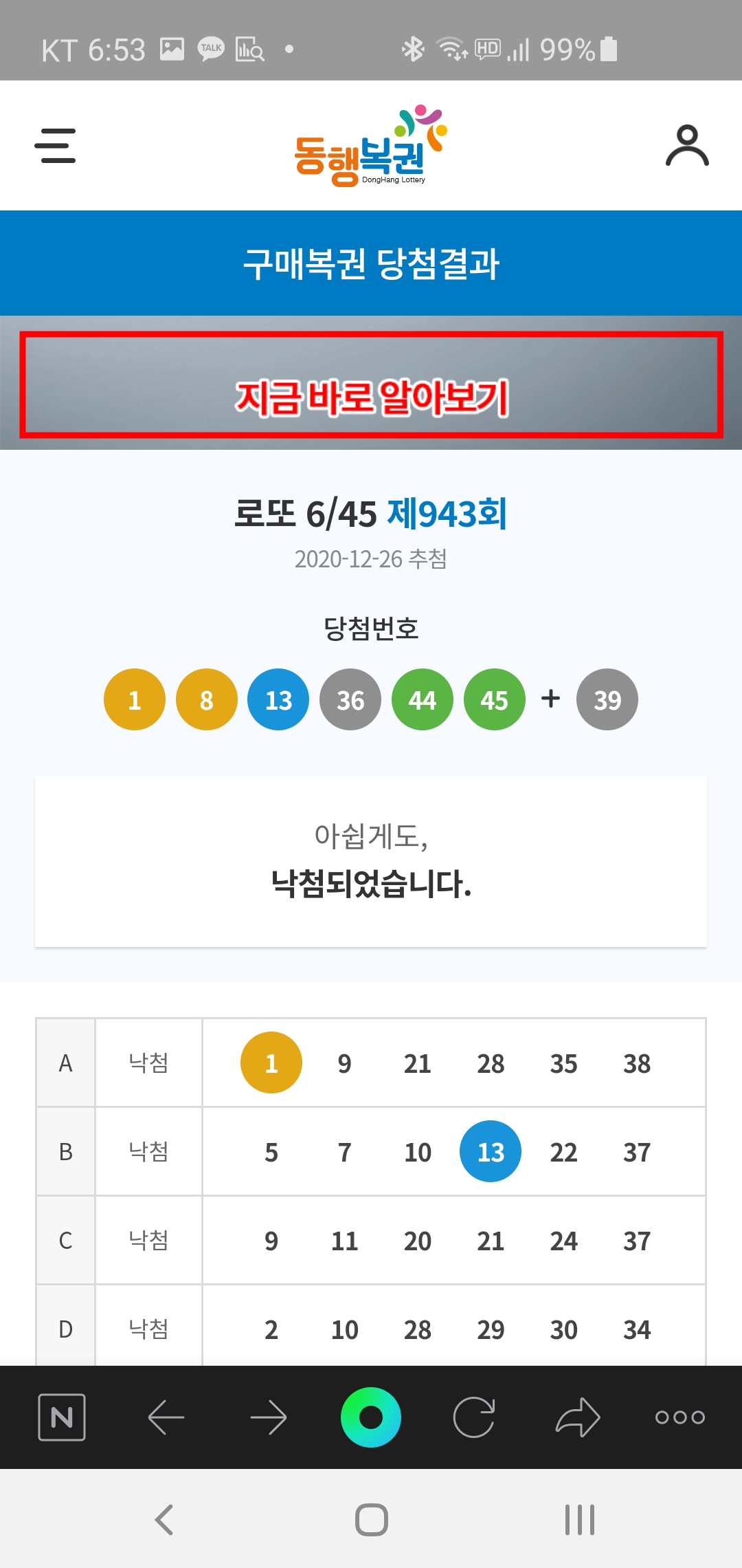 매주 월요일, 월요병을 이기기 위하여 전주에 구매했던 로또번호를 확인해 봅니다.