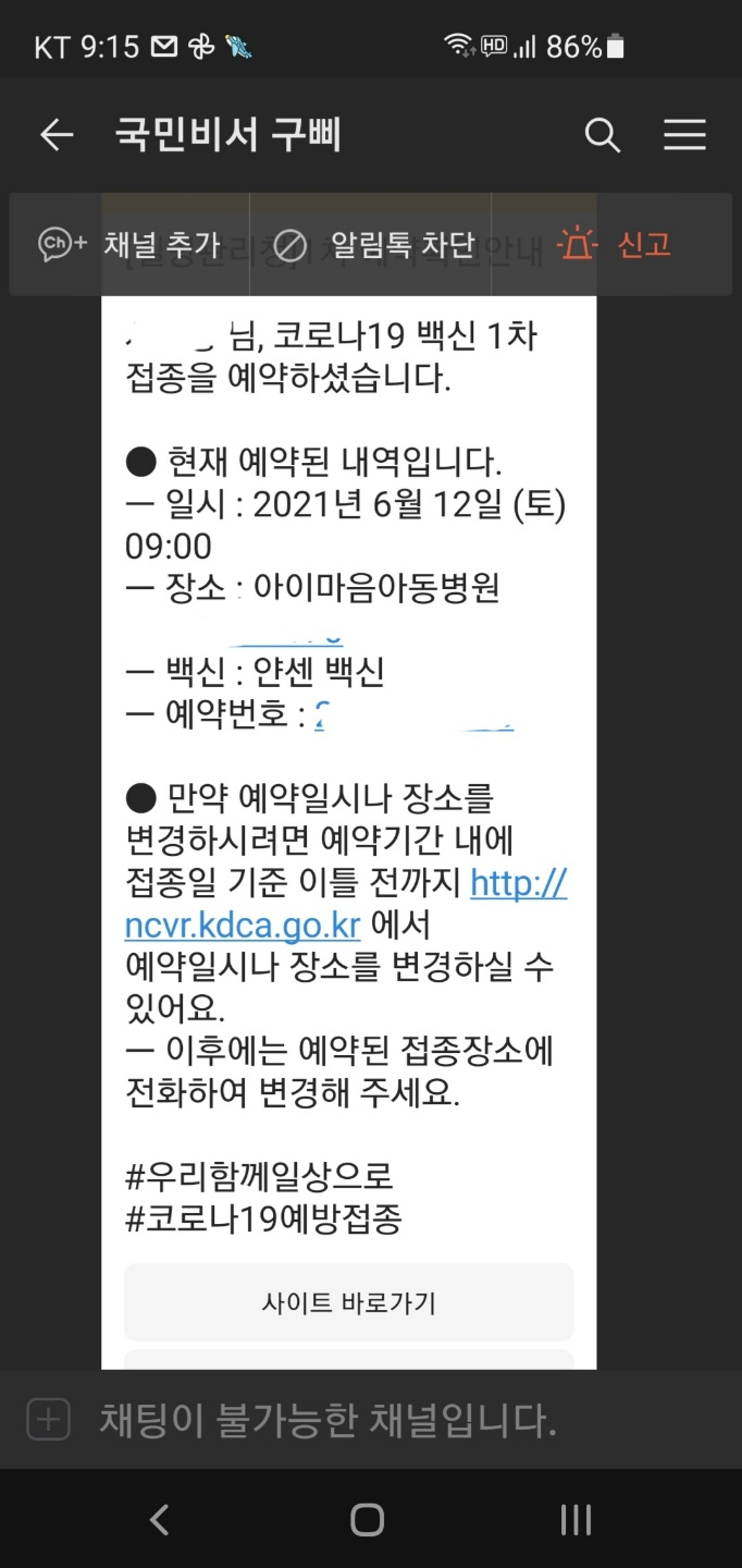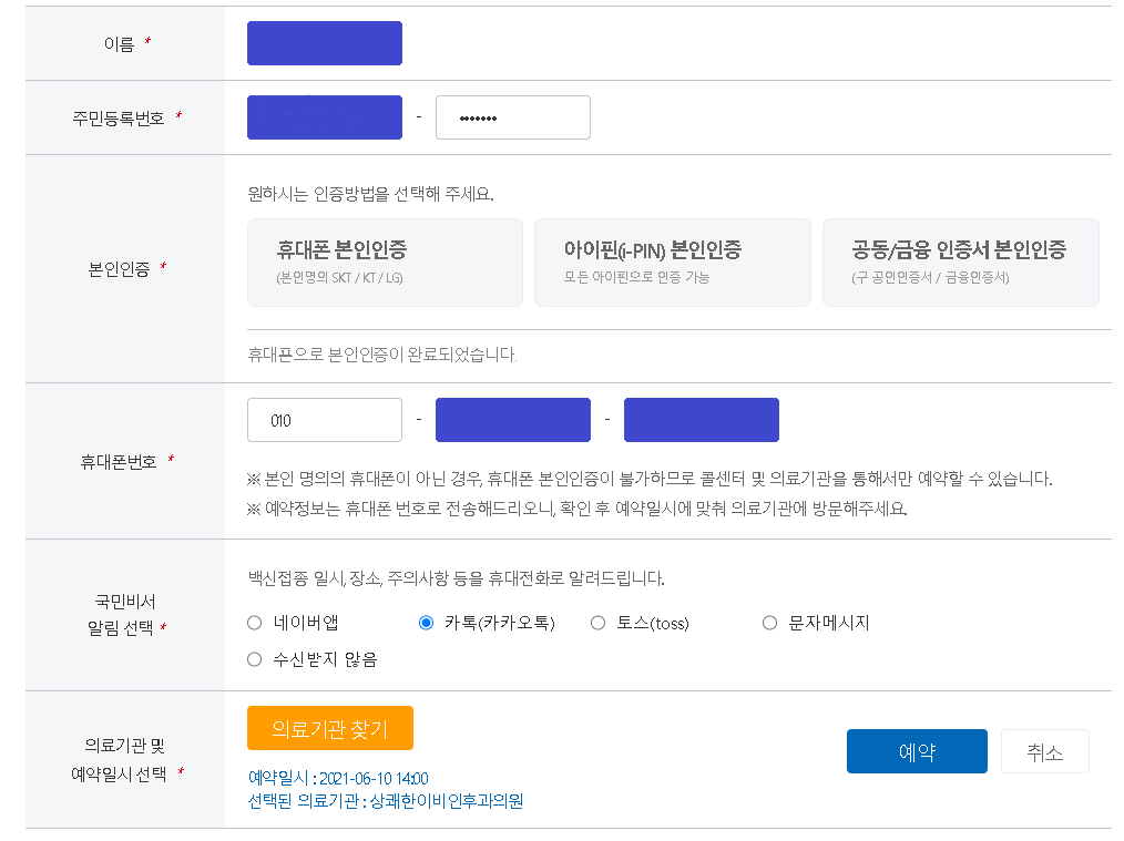 이로서 코로나 19 백신 예약하기가 완료되었습니다.