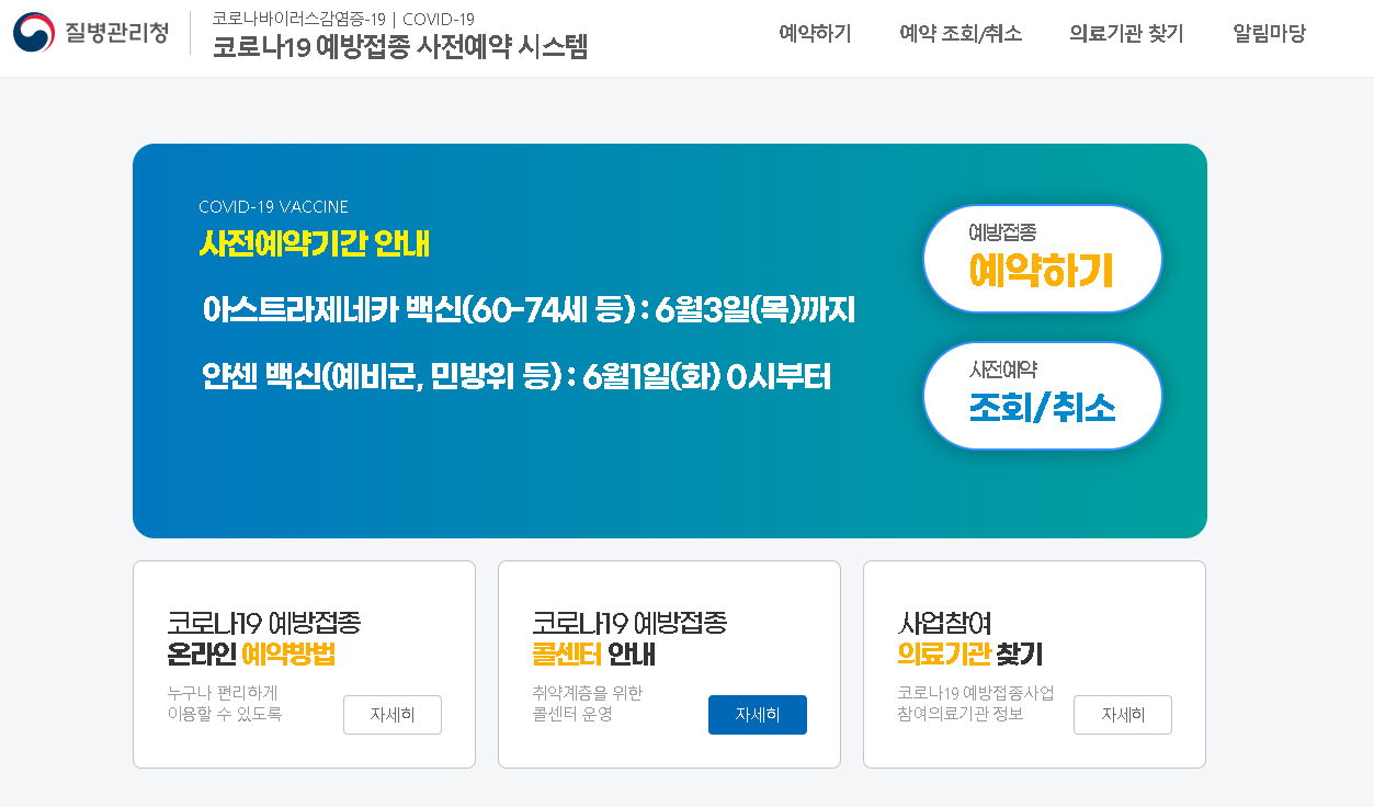 질병관리청에서 코로나 19 예방접종 사전예약시스템에 접속해서 예방접종 예약을 해봅니다.