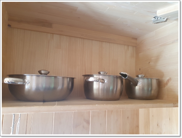 주방 상 단장을 열어보니 간단한 그릇과 접시, 냄비 등이 보였습니다. 프라이팬은 하 단장에 위치해 있었습니다.