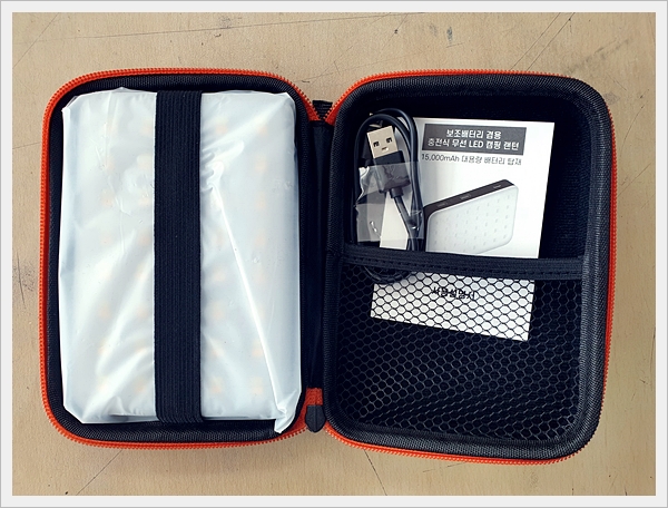 BOSSWIZ 충전식 무선 LED 캠핑 랜턴 BOS-15000의 상자를 여니 파우치가 포함되어 있었습니다.