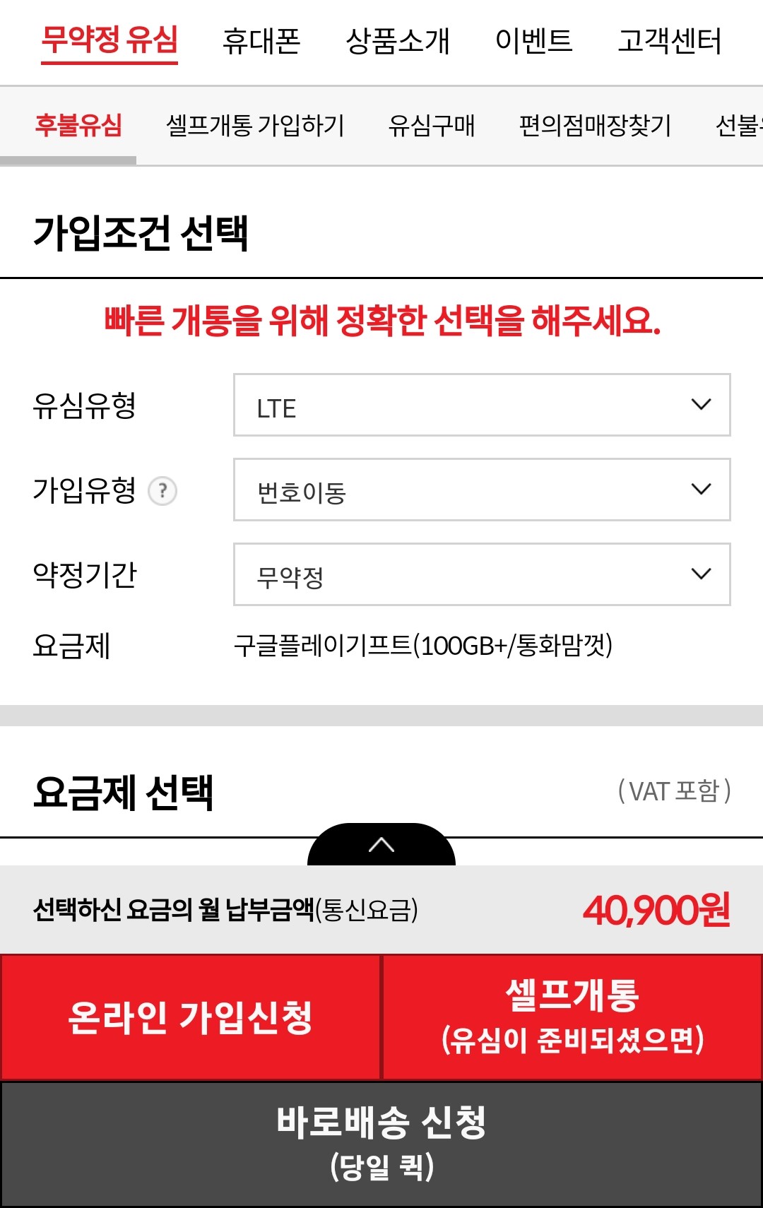 그리고 무약정 유심 --> 후불 유심(셀프 개통 가입하기)으로 들어가면 됩니다.