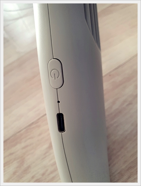 아이리버 BLDC 스톰 휴대용 넥밴드 선풍기 INF-P9의 우측 하단에 위치한 충전단자, 충전 LED, 전원 버튼. 단순한 구성!
