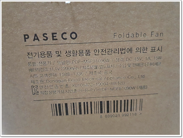 파세코 접이식 코드리스 DC 팬의 모델명은 PDF-MSFB1090W이며 2200mAH의 배터리를 내장, 소비전력은 15W입니다.