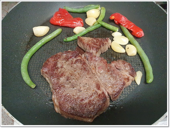 앞면 뒷면을 각각 1분간 구워주고, 가니쉬를 넣고 다시 4분가량 구워주었습니다.