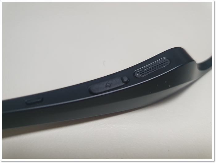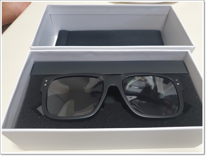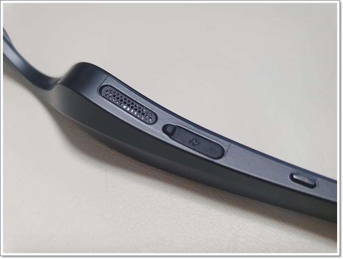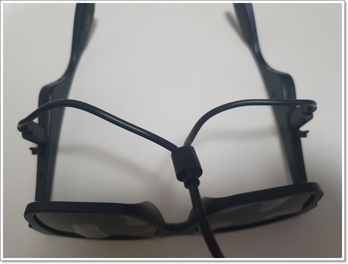 선글라스형 블루투스 이어폰 SKY FIT SG1은 양쪽으로 충전 케이블, 전원 버튼, 스피커 2개, LED가 보였습니다.