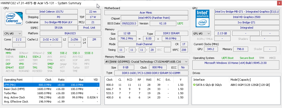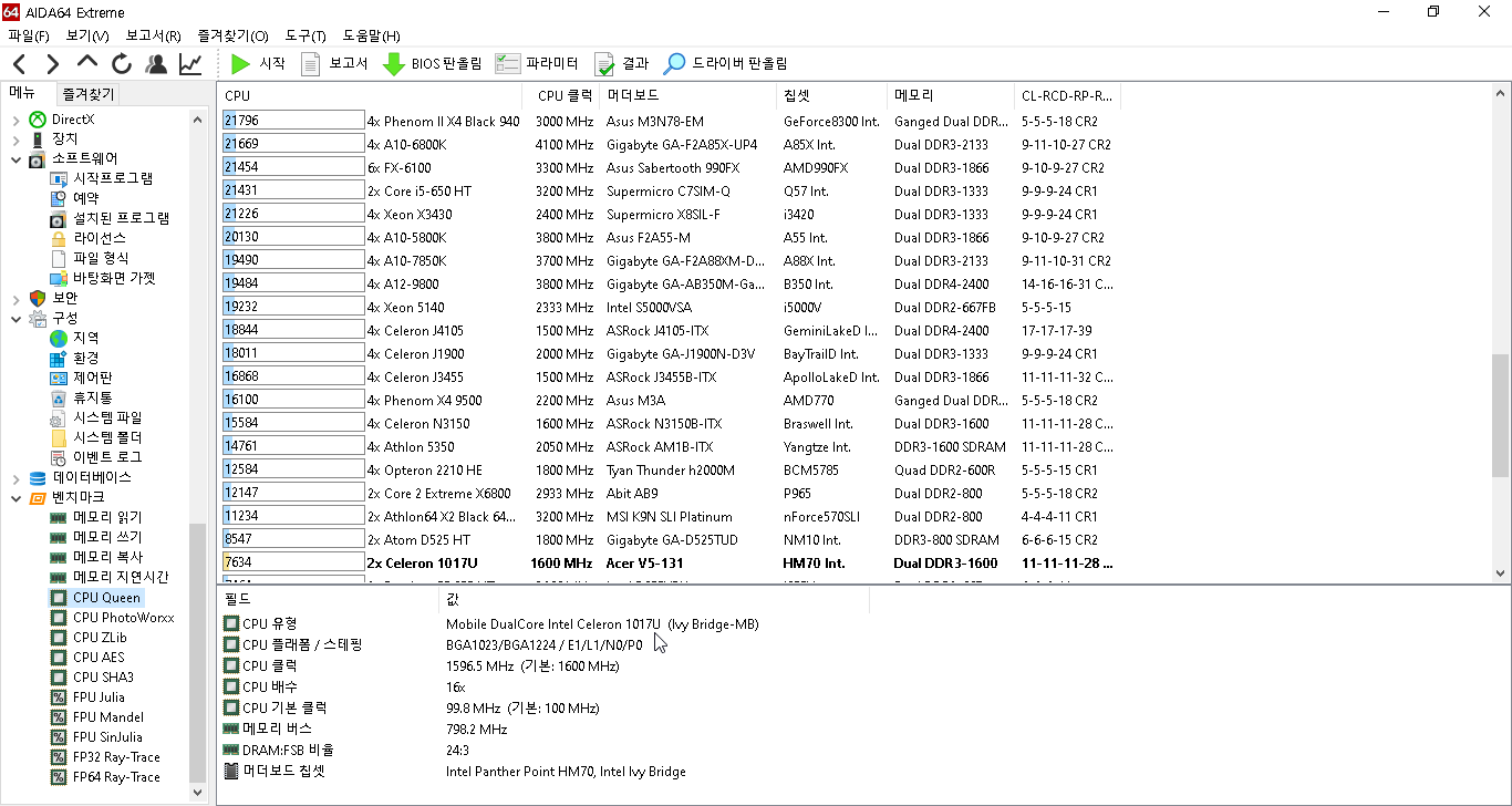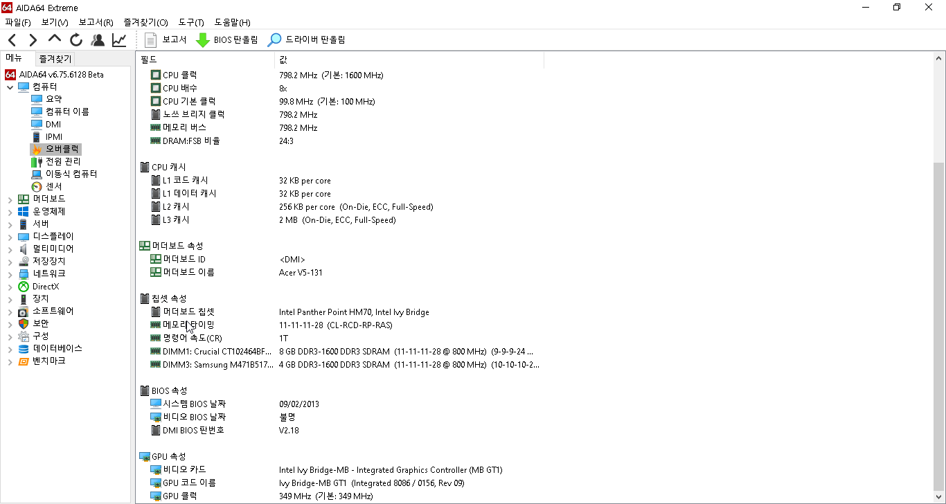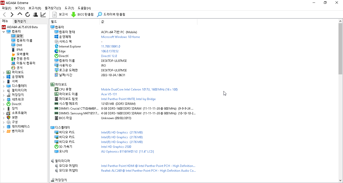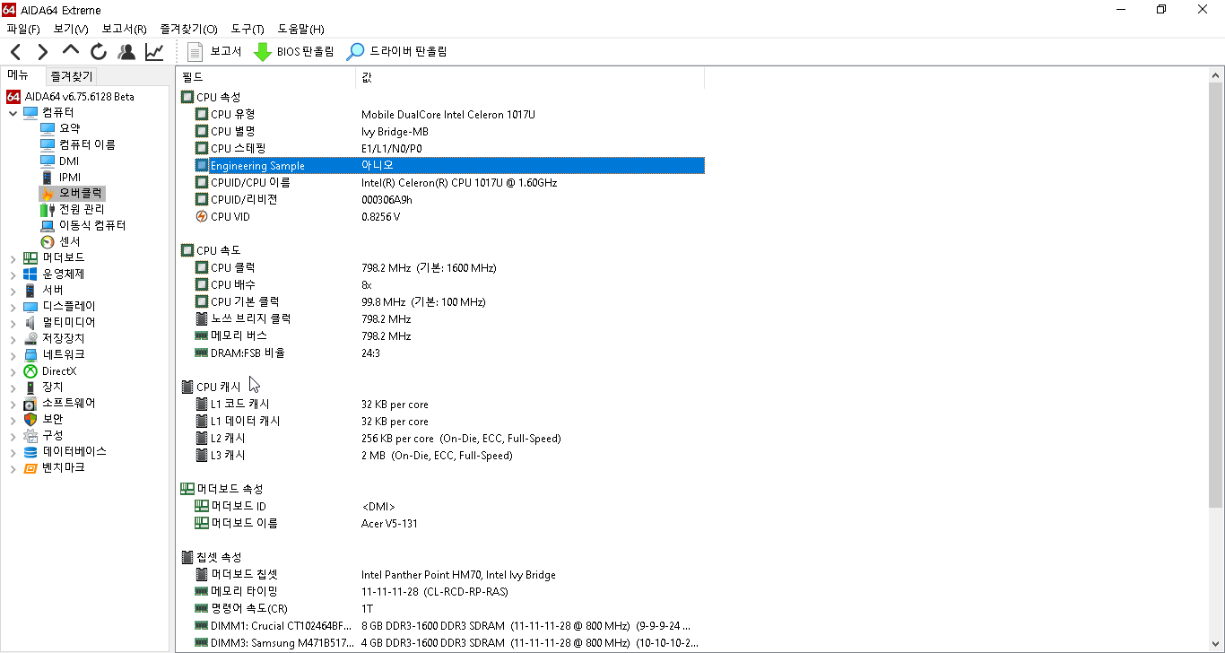 그렇다면 AIDA64로 에이서 V5-131-10172G 노트북 컴퓨터를 살펴보겠습니다.