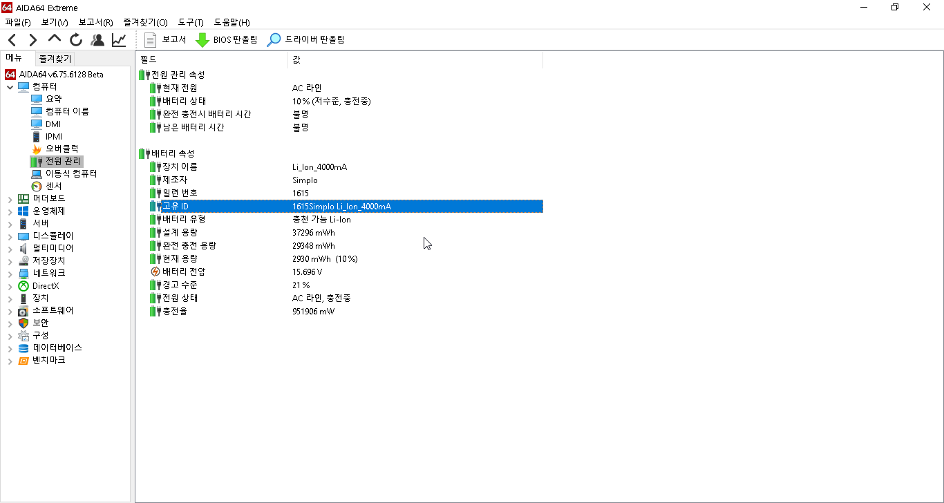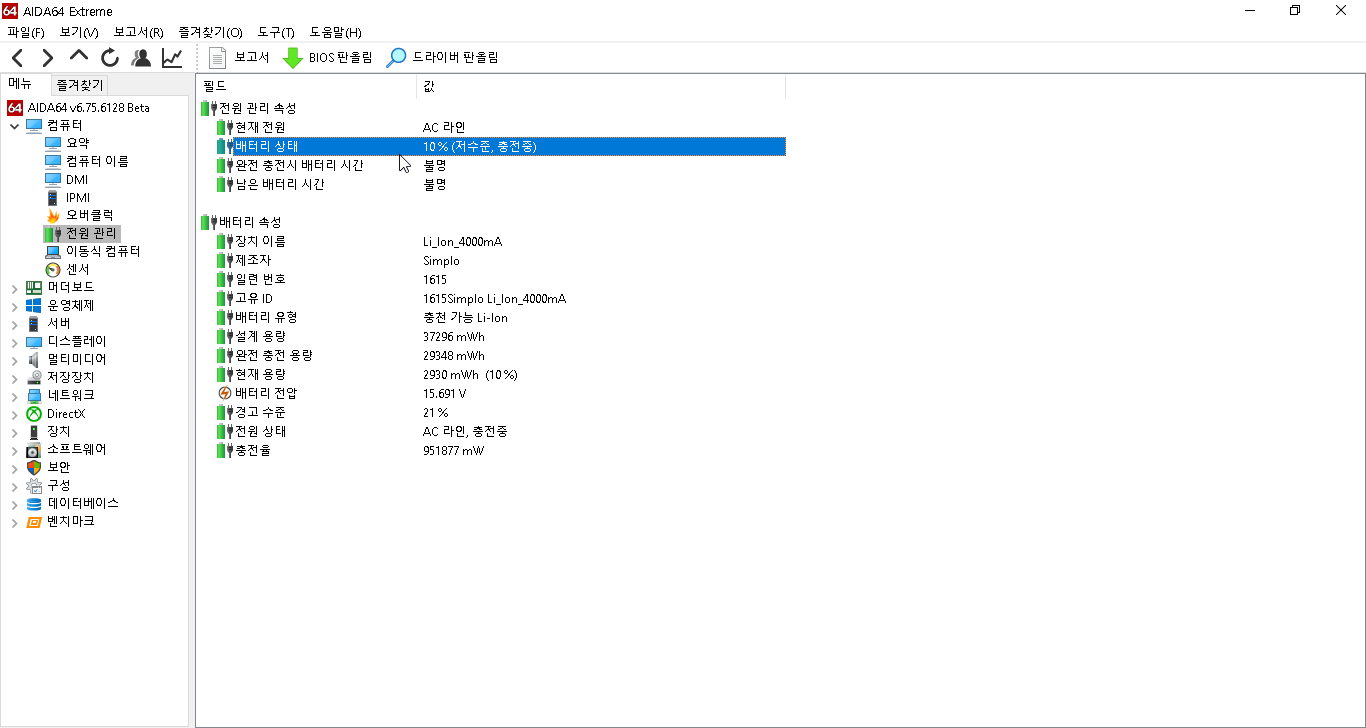망가진 배터리. 10%수준밖에 살아있지 않다고 나옵니다만 실제로는 충전이 전혀 되지 않습니다.