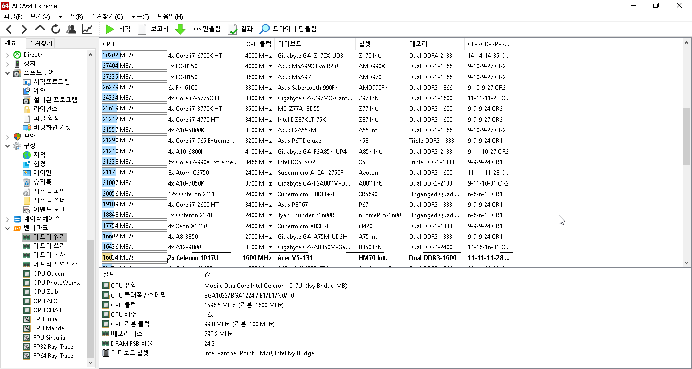 메모리 읽기 벤치를 돌려봤습니다. 아무래도 단순한 메모리지만 CPU속도에 영향을 받는 걸 알 수 있습니다.