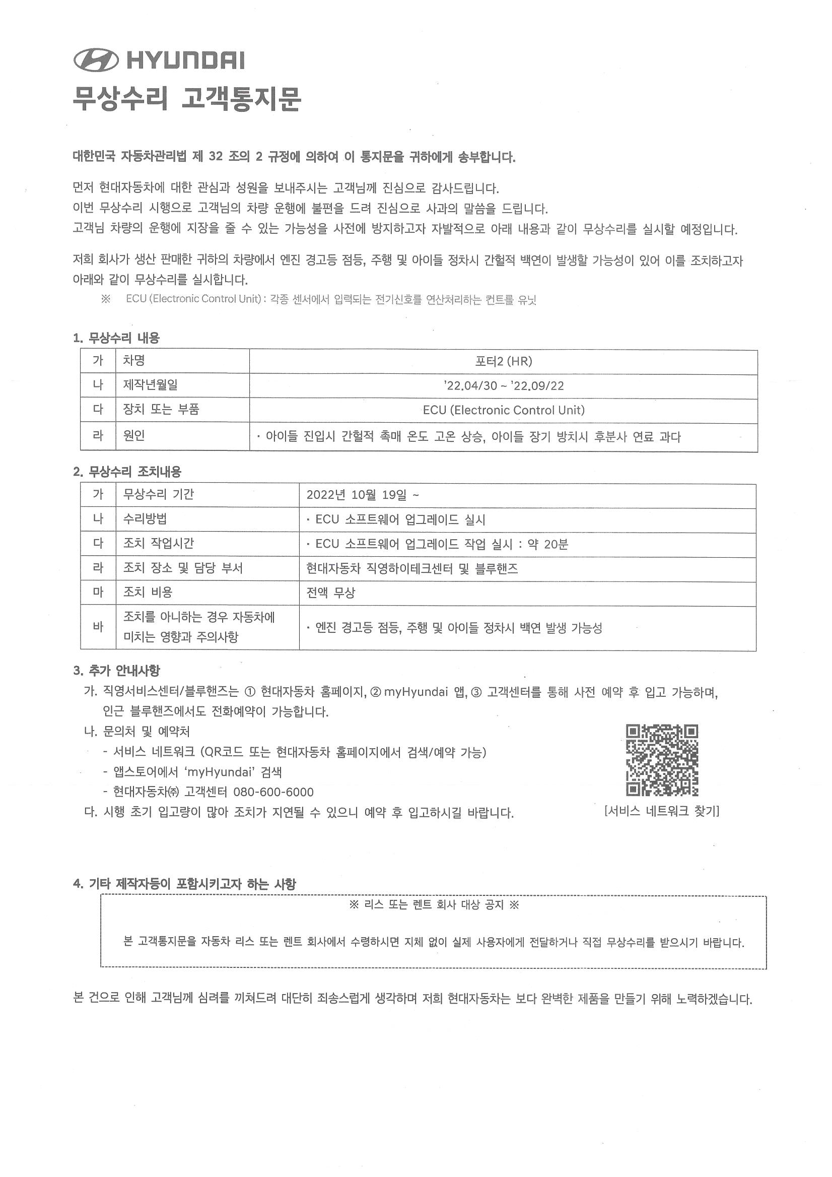 블루핸즈에 두어차례 입고하였음에도 에러코드 삭제외엔 별다른 조치가 없다가 어느날 고객통지문이 날아왔습니다.