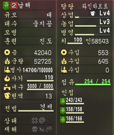 이렇듯 내정으로 올릴 수 있는 도시간의 능력 차이가 존재함을 인지하고 키울 도시와 키우지 않아도 되는 도시를 잘 구별해서 게임을 플레이하는 것도 한가지 요령일 듯 싶습니다.