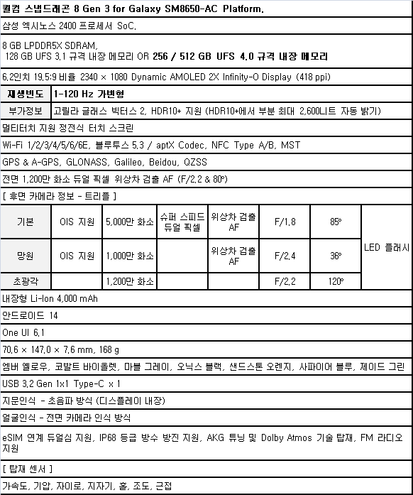개인적으로 S24 일반 버전에도 램이나, 스냅드래곤, 반사방지 코팅 등은 적용이 되었으면 어땠을까 하는 아쉬움이 남습니다.