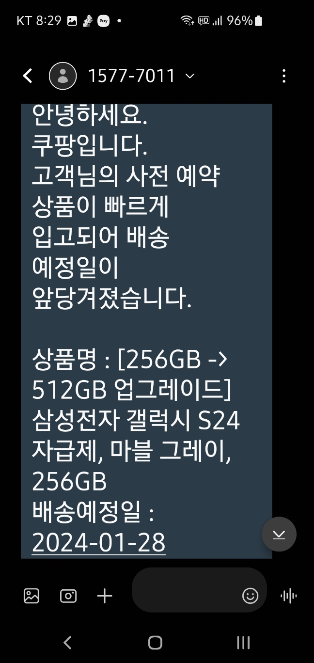 2월 9일 발송예정이었던 갤럭시 s24 일반모델이 갑자기 1월 28일 날 배송되었습니다.