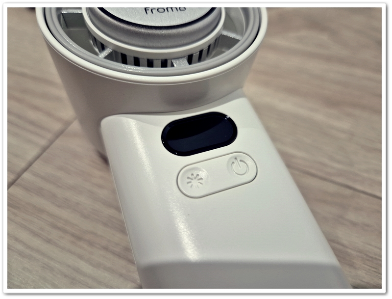 풍속 및 배터리 잔량등을 표시해 주는 LCD창과 전원버튼 및 냉각 기능을 위한 버튼이 있습니다. 이 두 버튼으로 풍속을 조절합니다.
